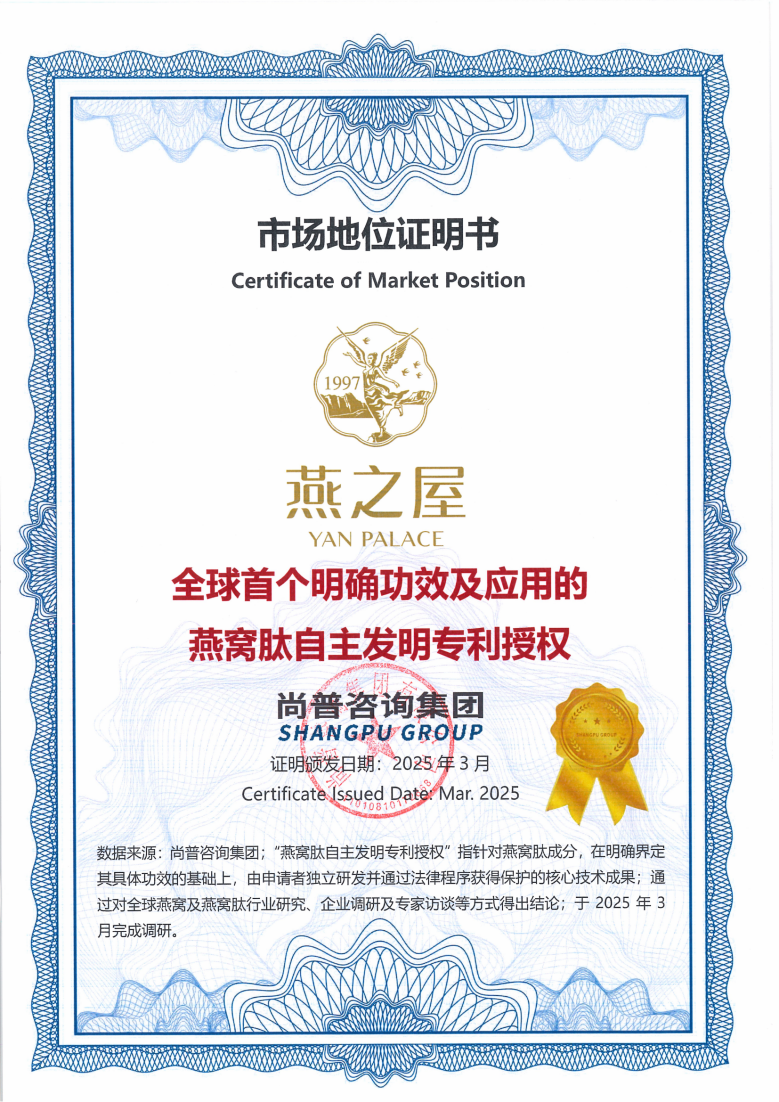 燕之屋多年來致力于燕窩肽研發(fā)與應(yīng)用,于2022年正式成立燕窩肽研究中心,開辟品牌在燕窩肽酶解技術(shù)、活性成分與功能研究的新賽道,多項(xiàng)研究成果刊登于國(guó)際權(quán)威期刊。2024年,燕之屋自主研發(fā)的“一種具有促進(jìn)細(xì)胞修復(fù)、高保濕美白功效的燕窩肽制備方法及應(yīng)用”榮獲國(guó)家知識(shí)產(chǎn)權(quán)局授權(quán)發(fā)明專利。經(jīng)權(quán)威機(jī)構(gòu)尚普咨詢集團(tuán)專業(yè)認(rèn)證,燕之屋更獲得“全球首個(gè)明確功效及應(yīng)用的燕窩肽自主發(fā)明專利授權(quán)”市場(chǎng)地位證明書,進(jìn)一步驗(yàn)證該專利的引領(lǐng)地位,夯實(shí)燕之屋在燕窩肽技術(shù)領(lǐng)域的引領(lǐng)者身份。